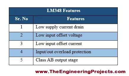 LM-348 has four internal amplifiers. We can achieve isolation between these amplifiers by biasing each of the amplifier independently. This isolation can be done using different techniques e.g. layout technique. It can be used at several different places where amplifier matching is needed. LM 348 has very low supply current drain as compared to the standard 741. Moreover, Its input voltage and input offset current is also lesser than the general 741. It has different features like no crossover distortion, low input offset voltage, low input offset current. input overload protection, output overload protection etc. It can be used at any place where there is a need of amplifier matching. The further detail about LM-348 will be given later in this tutorial.