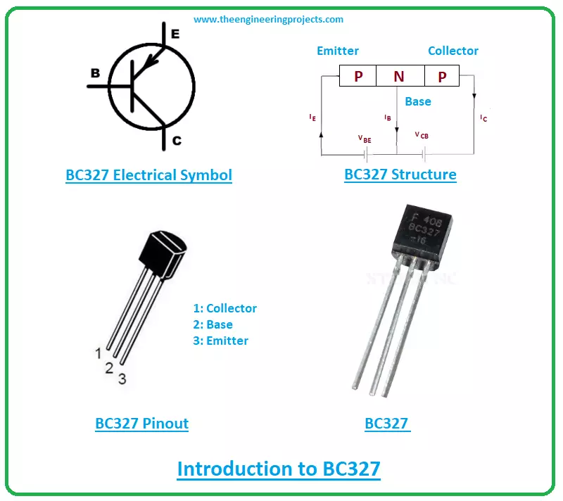 - BC327 is a PNP bipolar junction transistor that comes in the TO-92 package and is used for switching and amplification purpose.