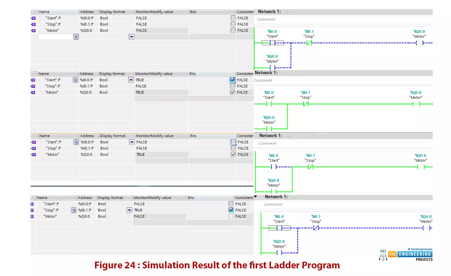 - Figure 24 shows the first four scan cycles. Notice on the left we can set the inputs on and off and see the effects on the right part.
