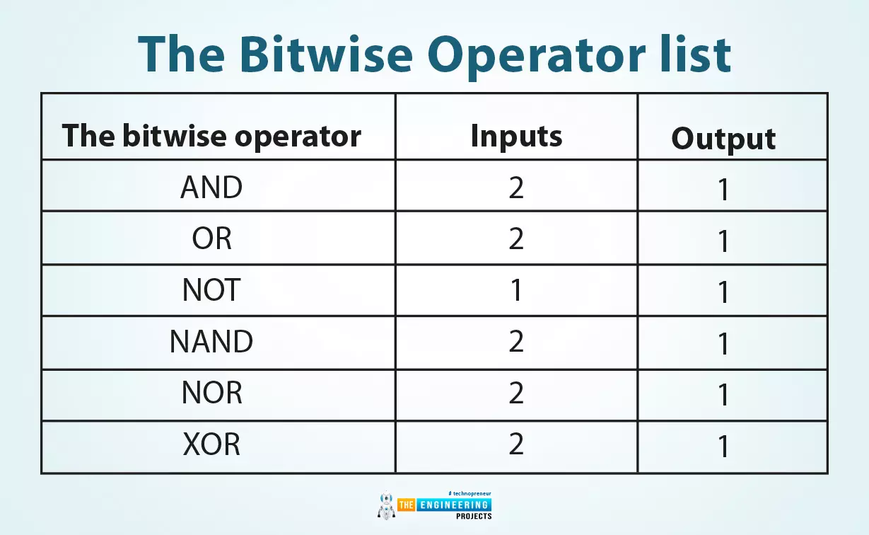 Despite we have talked about these, basics and concepts in one of our articles, we have seen it’s good to remind you briefly that basic is the ground for your foot to stand coding logical operations in ladder logic programming. for defining a logical operation, there is a truth table that shows the combinations of the inputs and the resulting output. For example, the bitwise operator that has only one input like “NOT”, has only two possible value for input which is high or low, True or False. And it has one output which is the negate of the input. So it is either TRUE or FALSE. To sum up, for every bitwise operator instruction, we are going to discuss its truth table showing the states of the possible combinations of its inputs and the resulting output as well. In addition, one example using ladder logic programming shows the operation practically. We come to see it is important to list the bitwise operators in table 1 below shows the inputs, output, and the symbol of the logical gate that is equivalent to that bitwise operator.