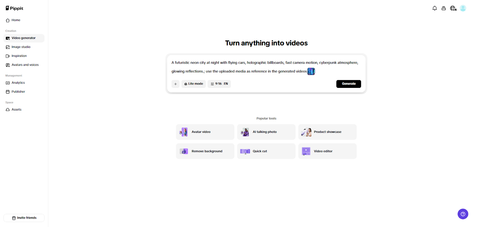 To create warm festival greetings, upload the visuals you want to use. First access the Pippit and signup. Then navigate to the "Video generator" tab. Press the "Add media" tab to upload your reference image. You may upload from a device, phone, dropbox, or via link. If you lack a reference image, select one from assets. Add a text prompt to describe the greeting style and mood. This helps Pippit video maker generate video exactly depending on the text prompt and reference image. When done, click the "Generate" tab.