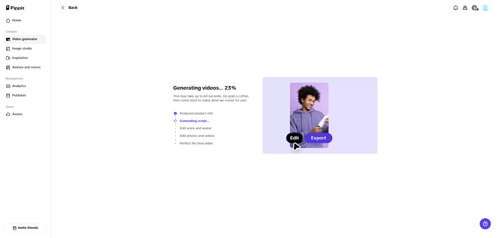 Your greeting begins taking shape instantly. The AI video generator in Pippit automatically edits and generate your video as per your text prompt and reference image. It manages transitions, pacing, and video-enhancements.