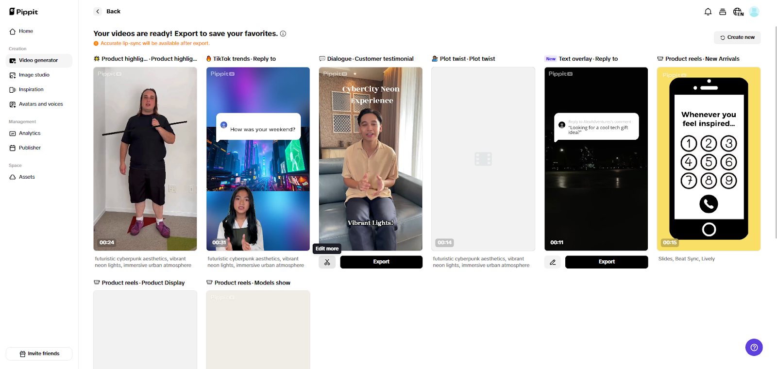 It auto adds avatars, voice, lyrics, captions, and photos/videos. It perfect your final video. You receive 4 to 5 drafts. Choose one and click edit more to open the Pippit editor if you want deeper customization.