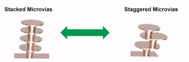 Stacked vias tend to void when copper-filled, and this may cause failures. This is avoided with staggered microvias because plating is used instead of vertical stacking, which leads to a higher long-term stability.